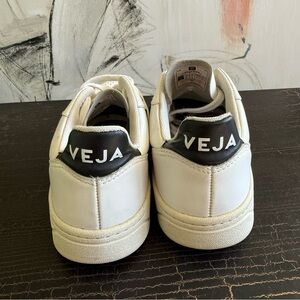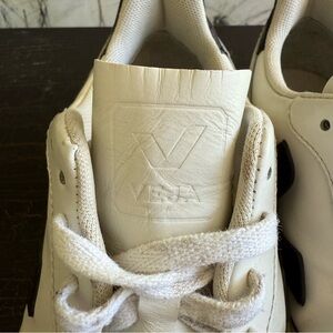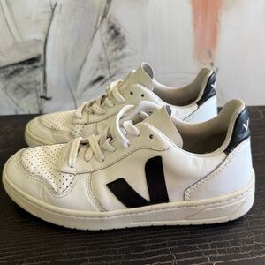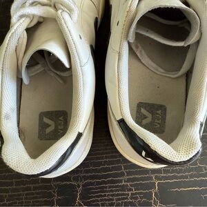 Stylish Veja sneakers. White leather with black accents. Comfortable and versatile.