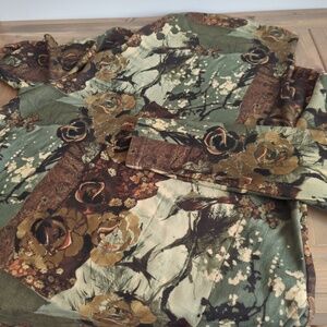 Earthy-toned floral and abstract patchwork design in shades of olive green, cream, burgundy, and brown.