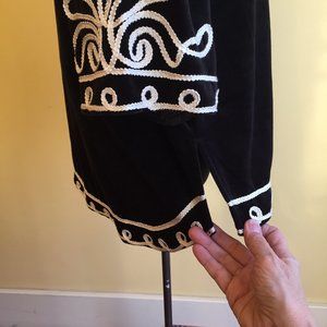 Dramatic, simple statement tunic in excellent used condition. Thick and rich natural cotton velour blend. Short side slits, measurements as shown, slightly raised hem in front. Dress this up or work your magic with a casual elegant look when paired with black leggings and boots.