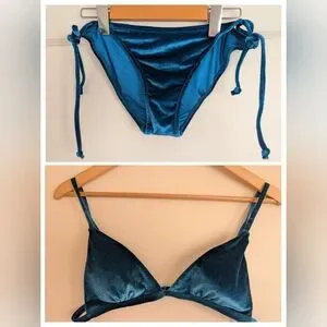 Luxurious velvet bikini set in a stunning teal color. Perfect for adding a touch of elegance to your beach collection