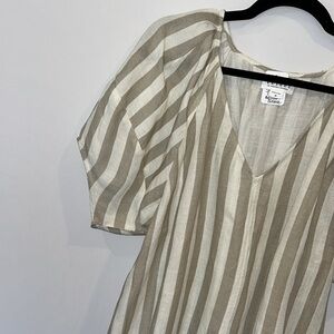 Boasting a relaxed fit, v-neckline, and breezy raglan sleeves. The striped pattern adds a touch of casual charm to this linen blend piece. Perfect for embodying effortless West Coast vibes in your everyday look.