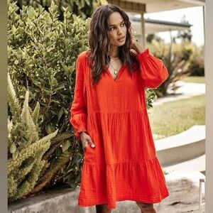 In a vibrant hue and with a relaxed silhouette, this dress is laid back and charming. Featuring a tiered skirt and a cinched cuff at the wrists, it’s made for spring afternoons and beyond.