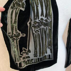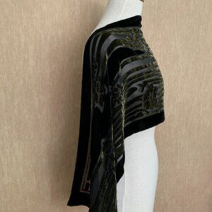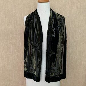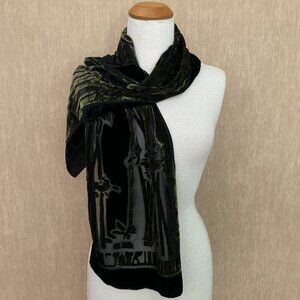 This is a beautiful and elegant velvet devore scarf (also known as "burnout velvet" technique). The scarf has a deep olive green base with a rich, see-through bamboo and floral-like pattern and a handrolled edging. The burnout method creates a stunning texture and a semi-sheer effect, making it a unique statement piece.