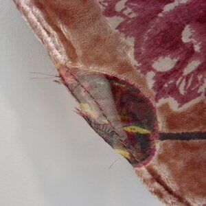 - gorgeous velvet babydoll dress features muted rose beige colour with purple, yellow and cream, a v-neck, flowy sleeves, an allover burn out fabric and is fully lined