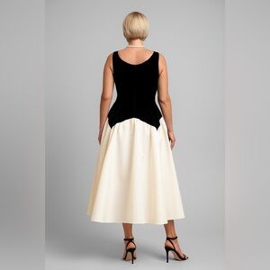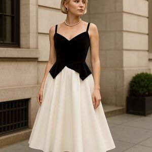 A timeless piece that merges vintage charm with modern sophistication. The Velvet Grace A-Line Midi Dress features a sculpted black velvet bodice with a sweetheart neckline and delicate adjustable straps, creating a flattering upper silhouette. The sharply tailored bodice dips into a pointed waist seam, leading to a voluminous off-white A-line skirt crafted from soft, flowing fabric. Ideal for cocktail evenings, gallery openings, or formal gatherings, this dress exudes refined elegance with every step. Pair it with pearls and heels to elevate its classic appeal.