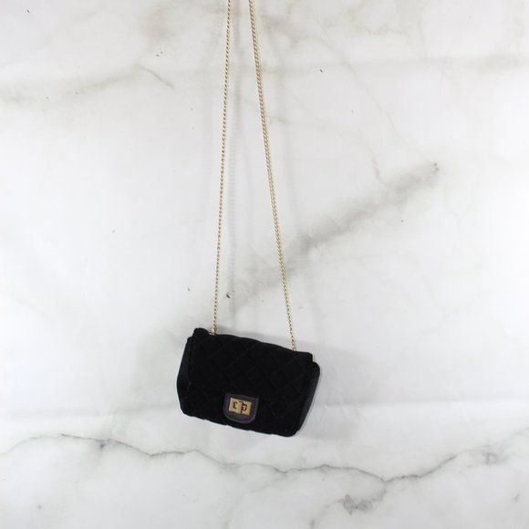 Super Cute Vintage 90’s vibe quilted mini bag, features a gold chain and enough space to fit cards and an iPhone(not plus), finished in a soft velvet material.