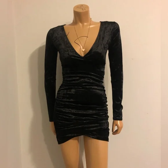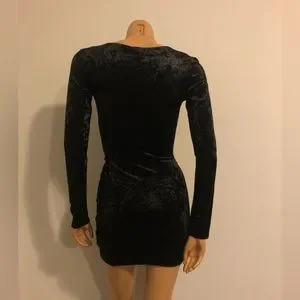 This is a long-sleeve velvety mini dress, perfect for a night out! Worn only once, the dress is looking for an owner who isn’t afraid to pair it with a daring leather jacket, or even a pair of knee high boots!