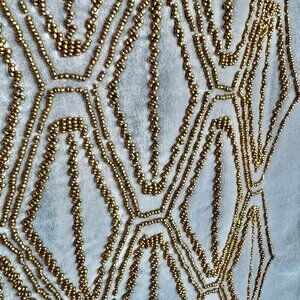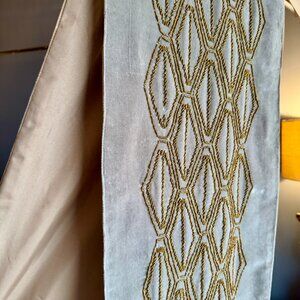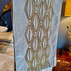 Soft velvet taupe-greige table runner with intricate geometric bronze beads. Good used condition, has a few lighter rub marks and a fabric line near the center as seen in photos. Measures 72 inches (6 ft) long. Cat friendly, nonsmoking home.