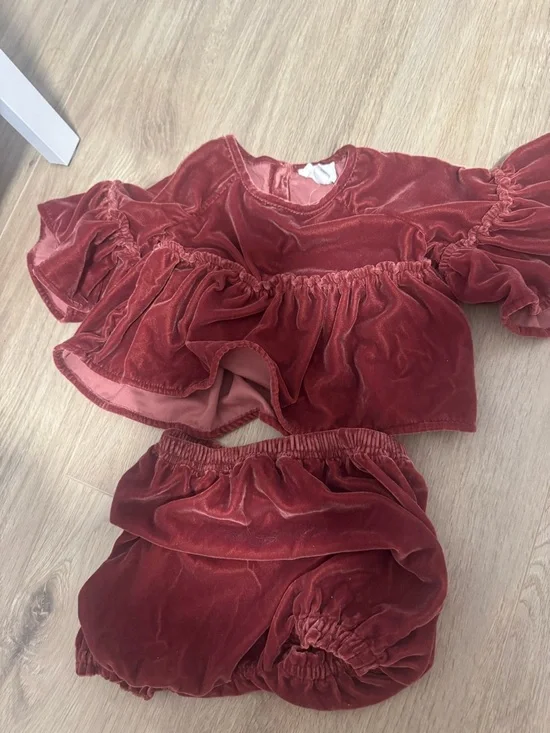 Soft velvet two-piece set. Includes gathered long-sleeve top and matching bloomer. Deep rust color. Plush, cozy texture. Cute and stylish baby outfit.