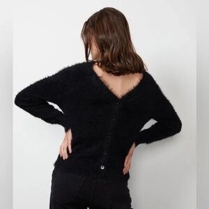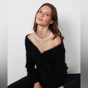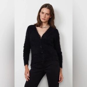 This classic cardigan silhouette gets a luxe edge when crafted from this kitten-soft stretchy knit with its feather-like texture. Featuring ribbed bands at the cuffs and around the neckline and buttons, it's perfect layered, on its own or add a dash of unexpected sex appeal and wear it backwards. 3rd possibility: wear it off the shoulder.