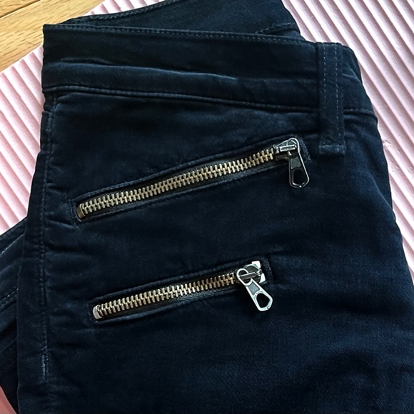 Soft and comfy, mid-rise Rag & Bone pants with a velvety finish. Gold zipper detailing on the hips and ankles.