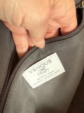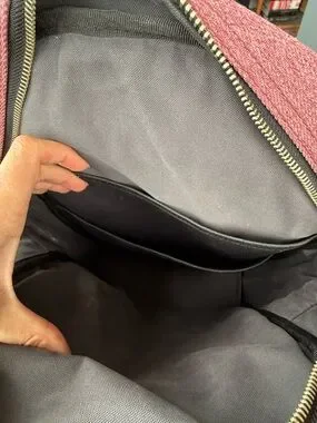 Versatile backpack in mauve fabric with tan leather accents. Clean design with secure flap closure and sturdy zippers. Comfortable, padded straps and extremely well-padded laptop compartment. Lots of additional interior pockets and one exterior pocket.