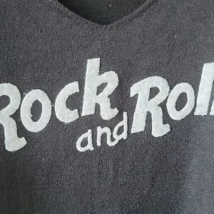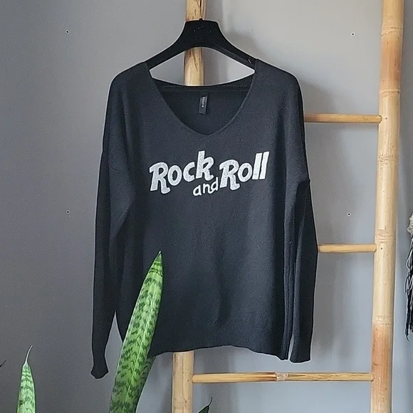 Made in Italy, beautifully soft scoop neck sweater has contrast Rock & Roll flocked graphic. Viscose but feels like cashmere.