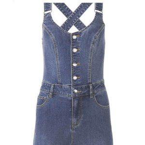New in package, denim skinny leg overalls. These Denim Overalls combine traditional 5-pocket styling with adjustable straps that crisscross in back, all in one sleek, scoop-neck jumpsuit! Tapered from neck to the ankle, this fitted jumpsuit features center front buttons, sewn-in seams at the bodice and a sewn-in waistband complete with belt loops!
