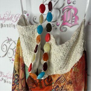 Crochet knit top area with bead halter. Very unique. Size large. Stunning. Get ready for an abundance of compliments! π Youβll be celebrated for your exceptional taste! π
