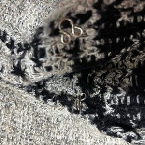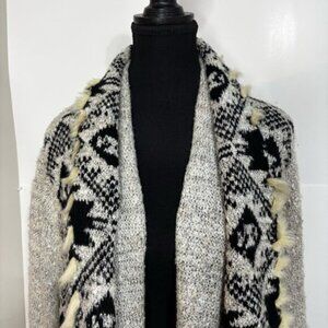 Stylish boho knit cardigan with faux fur fringe details. Perfect for layering. Unique geometric pattern. Bell sleeves and hook and eye closure. Warm and relaxed knitting.