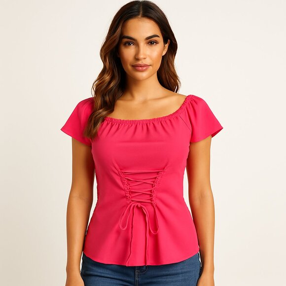 Venus gorgeous off shoulder top in hot pink. Lace up front detail. Awesome paired with jeans, a dark skirt or pants.