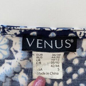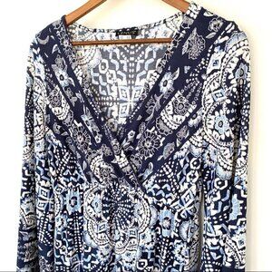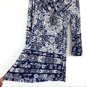 Pullover style dress with lots of stretch. Fabric is very lightweight. Elasticized waist. Skirt flares out a bit. In a blue & white print with contrasting borders.