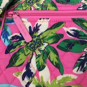 This Vera Bradley Hipster is a lovely addition to any wardrobe. With its medium size and adjustable crossbody strap, it is perfect for a day out in the sunshine, or a trip down south. The colourful quilted green and blue floral pattern on bright pink accents has a tropical look, and stylish form.