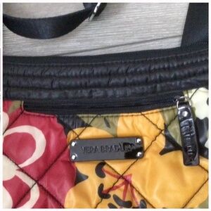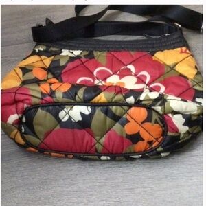 Big, perky, red, gold, and white flowers and orange berries on a black background brighten up this whimsically decorated Vera Bradley 100% polyester puffy quilted fabric shoulder bag with zippered closure.