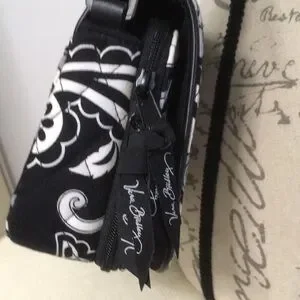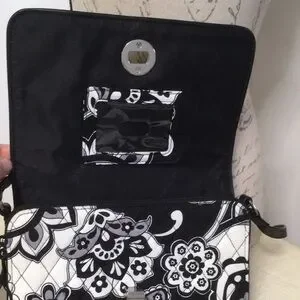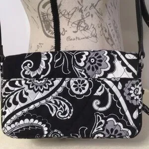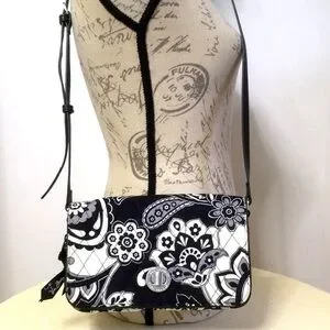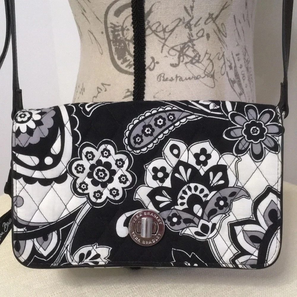 Oh, so elegant, and versatile, this Vera Bradley turn lock crossbody bag in a dramatic black and white quilted Midnight Paisley fabric print will complement every outfit. Compact, yet roomy, with multiple pockets, black vegan trim and shoulder strap, it will be your new fav go-to everyday bag.