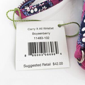 This beautiful Vera Bradley "Carry It All" wristlet, called Boysenberry, is brand new with tags. It has numerous pockets, including an exterior compartment for a small cell phone. The wristlet has a full zip closure and comes with a wrist strap (one end of the strap is permanently attached, while the other end can be attached in 2 different positions using the sewn in metal rings). Here are the features and dimensions: