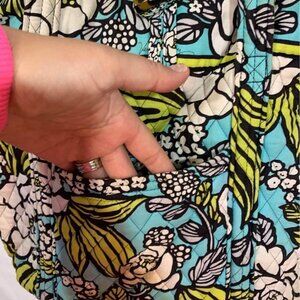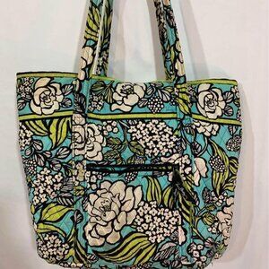 Vera Bradley duffle bag. Teal/yellow. Tortoise buckle. 9 compartments. Some wear. 17” wide, 14” tall.