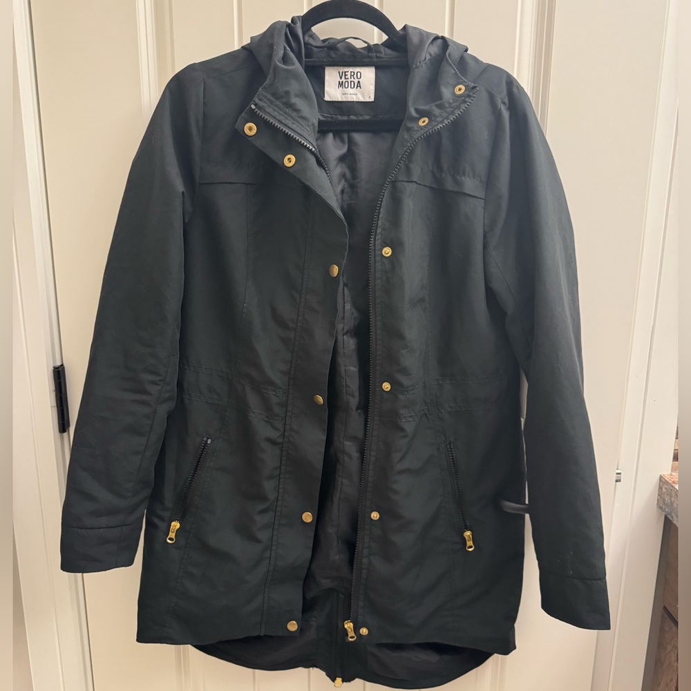 Lightweight, cinches at the waist with gold buttons and a zipper. Size: S Colour: Black Condition: Excellent