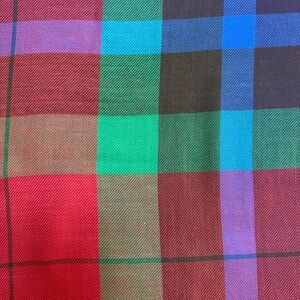 This bold vintage Vera scarf showcases a striking tartan plaid in deep navy, emerald green, crimson, and bright cobalt blue. Made in Japan from soft 100% acrylic, it has a smooth handfeel and a lightweight drape perfect for layering. The generous square cut allows versatile styling — wear it wrapped, knotted, or draped for a timeless look. Vera is a beloved designer brand known for its quality prints and wearable art scarves.