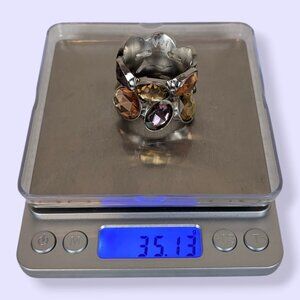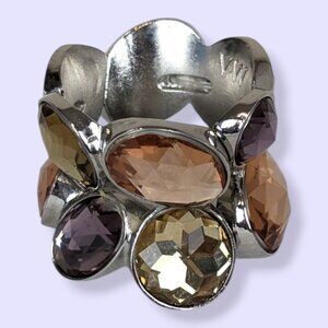This silver tone topper by Vera Wang is made of a silver tone metal and has 2 pieces strung together with elastic. There are different coloured faceted plastic stones around the exterior in oval and circle shapes. This piece appears to have originally come from the top of a Vera Wang perfume bottle. The bottle is now gone but the piece can be used to loop around a scarf or as another kind of accessory. There is a slight cloudiness in the stones and the interior of both pieces are marked VW.