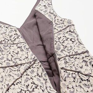 The dress features a beautiful beige and gray lace overlay with intricate piped seams that create a unique and flattering pattern. It has a sophisticated double V-neck design—one in the front and one in the back—adding a touch of allure. The flowy maxi silhouette and high-quality lace make it both comfortable and chic.