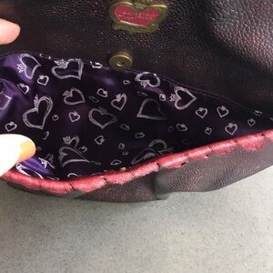 In great condition. Only sight of wear is on the front ribbon. Faux leather. Black with a red metallic glitter. Big fringe tassels. Very clean. Straps have a part with croissants chain. Very cute!! Measure: 10,5’’ large x 8’’ height.