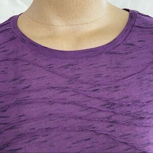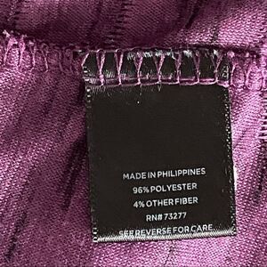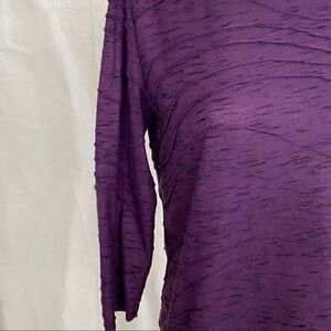 Polyester, round neck, medium, 3/4 length sleeve, plum colour, neck to hem 25”, armpit to armpit 19”, armpit to cuff 11.5”
