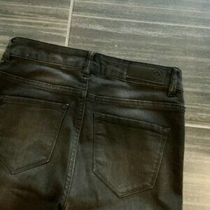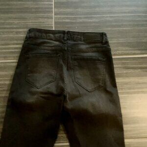 These are UNIQUE, FUN and SEXY! They have a beautiful velvet/sparkle tux stripe on the entire length of the side of the leg. They are mid rise and taper at the bottom with some stretch. They are not pure black but have some lighter black in them as the pictures show. I purchased them in Panama in a beautiful big store like Nordstrom. I love the sparkle on the side as they look great dressed up with heels OR dressed down with sneakers and t-shirt.