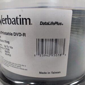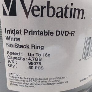 Verbatim Inkjet Printable DVD-R White No Stack Ring 50 Pcs 16x 4.7GB 95078 NEW