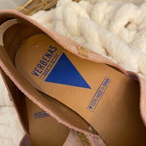 Gorgeous Verbenas espadrilles in a soft blush pink suede. Classic slip-on style with a jute-wrapped sole and rubber tread for added comfort and durability. Made in Spain, these shoes combine traditional craftsmanship with modern style. Light wear on the soles, uppers in great condition—perfect for summer strolls, travel, or casual outings.