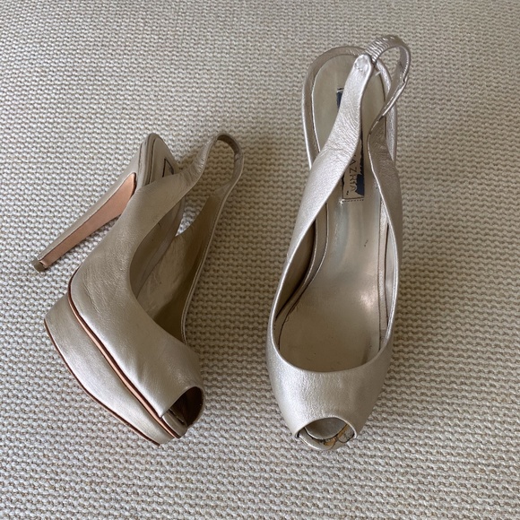 BCBGMaxazria gold tone leather sandals. Five inch heels with peekaboo toe. Slightly scratches on heels.