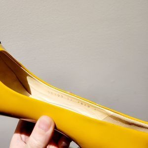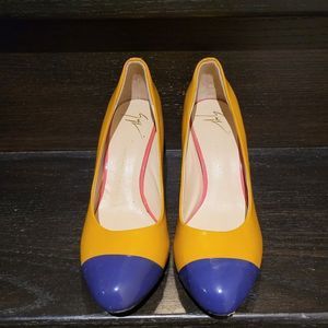 Stylish Vero Cuoio heels. Bright yellow with a bold purple toe. Perfect for a pop of color.