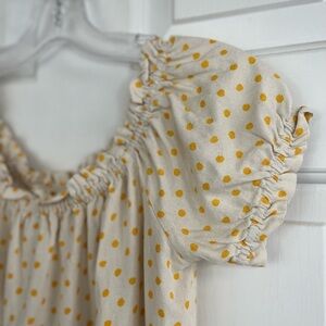 Linen. The perfect fabric for warm weather. It’s moisture wicking, breathable & wears well. This little gem is new with tag with charming polka dots & ruffle trim.