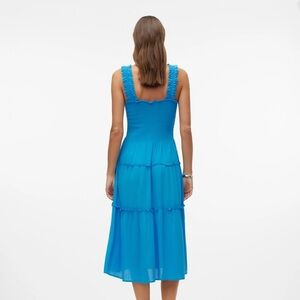 This elegant blue sundress by Vero Moda is ideal for wedding guests and cocktail occasions. It features a chic square neckline and a sleeveless design, offering a sophisticated and airy feel. The midi length and flowy silhouette provide a graceful and comfortable fit. New with tags.