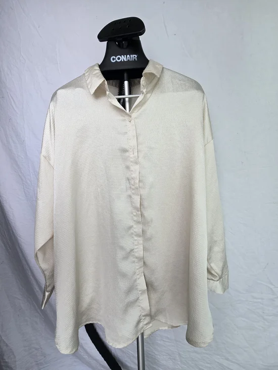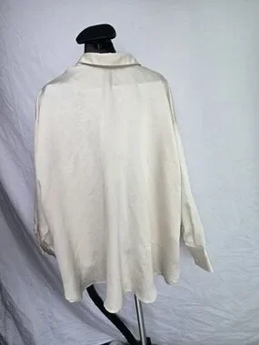 Lightweight button-front blouse. Relaxed fit with soft drape. Point collar and long sleeves. Subtle textured fabric. Versatile neutral for day or work.