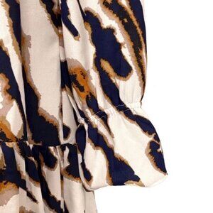 style tags: Vera Modo, peplum, animal print, boho, relaxed fit, flowy, long sleeves, fluted cuffs. Women's size XS