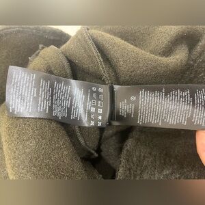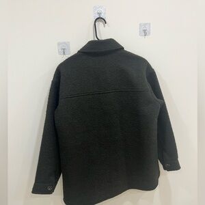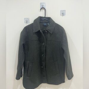 Elegant olive green coat with a sleek design. Features a button-up front and two practical pockets. Never worn. Please see the pictures for measurements.