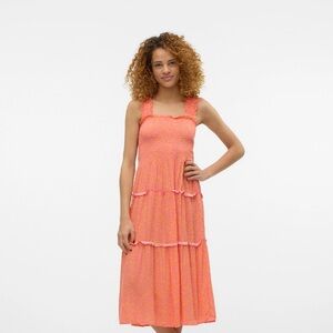 Embrace casual elegance with this Vero Moda sundress, featuring a vibrant orange and pink hue. The one-shoulder design and sleeveless cut offer a chic and breezy look, perfect for warm weather outings. Its flowy A-line silhouette and defined waistline create a flattering fit, making it a stylish choice for any casual occasion. New with tags Sz medium