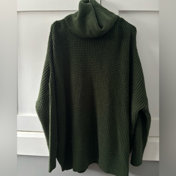 A knitted over sized turtle neck in a dark forest green bought from a small boutique store. Hits below the waist looks nice with a fitted pair of jeans or leggings, neck line very over sized can be styled in multiple different ways. Comes in a L, runs big for the oversized look