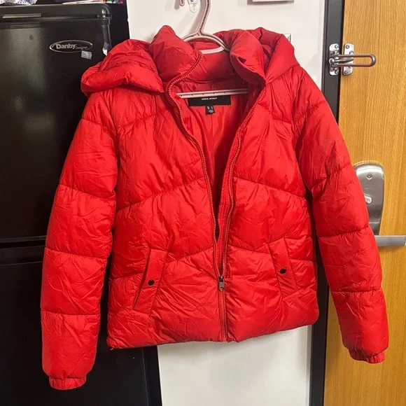 Stylish red puffer jacket by Vero Moda. Features a cozy hood and front pockets. Ideal for warmth and style.