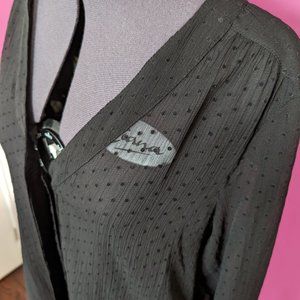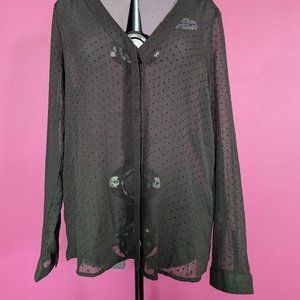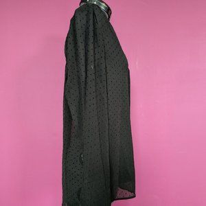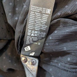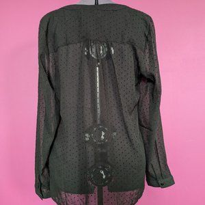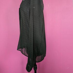Brand new without tags, never worn black sheer blouse by Vero Moda. Features tiny black polka dots, so it's not too loud. Size Large. Features v-neck, high-low style waist with back longer than front, and is tunic-length in back so easy to pair with leggings or cigarette pants.