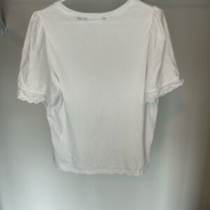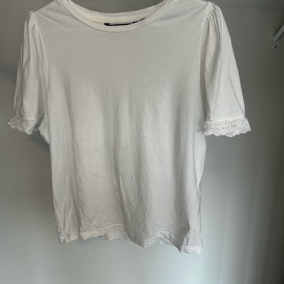 Chic white top with lace-trimmed sleeves. Ideal for casual elegance.