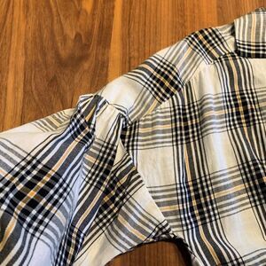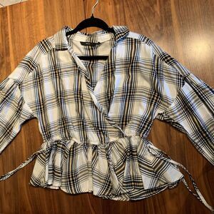 Vero Moda blouse, top with unusual detailing in the dropped shoulder with gathering at the dropped seam for feminine soft volume. Elasticized waist also gathers and extends to a short peplum to emphasize curves comfotably. 100 % cotton, unlined for comfortable wear. Pull on with a deep V neck and added cords at the side to tie or leave dandling for visual interest. Winter white with black and deep ochre yellow check. Size medium. Excellent used condition with no wear, damage or stains detected. Layer with T or cami or wear singly with your favourite midi skirt, jeans, dress pant. Fun, flirty, feminine. Grab a few finishing pieces from Our Closet (some suggestions shown all listed and price separately) and build a complete new look. Just for you from Lemon Squeezy Shop🍋