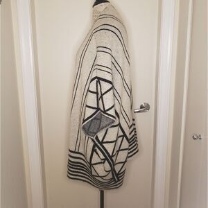 Unbelievably cozy, creamy white & black Art-deco stripes, acrylic nylon wool blended knit, labeled Size S, but easily fits S-XXL, flat lay: Pit-37 (lightly closed), Length-33, Excellent Like New Condition.